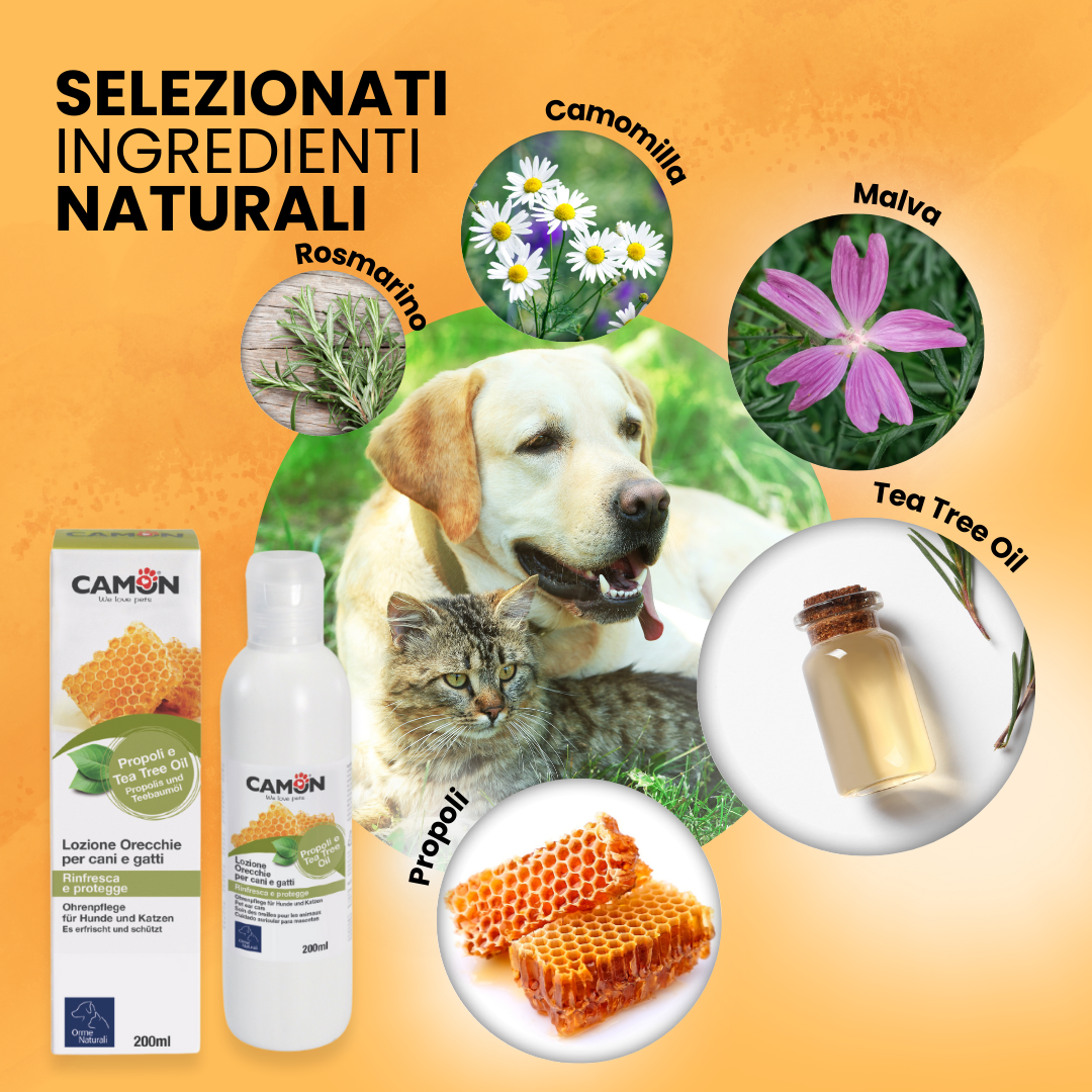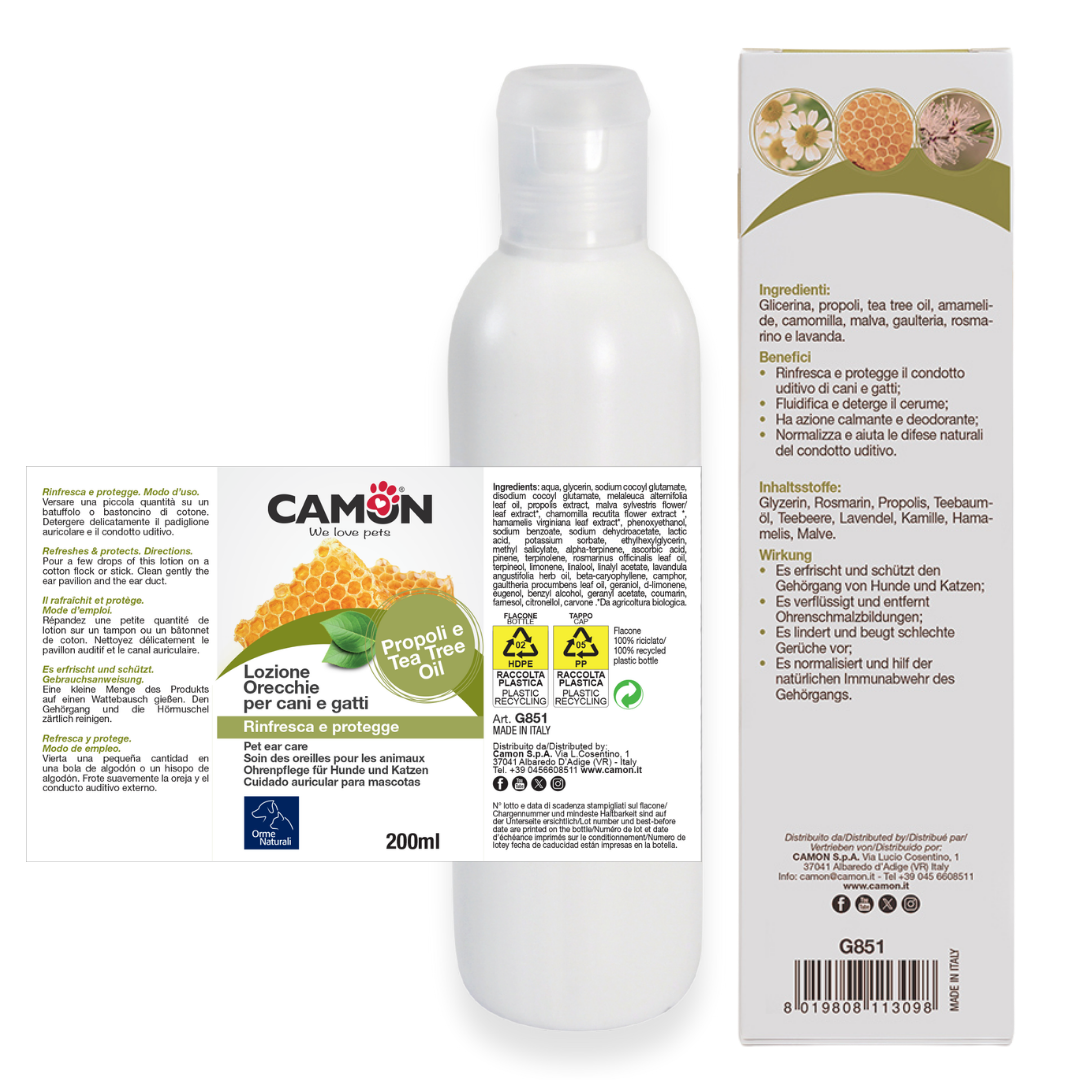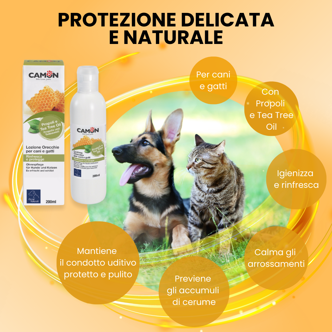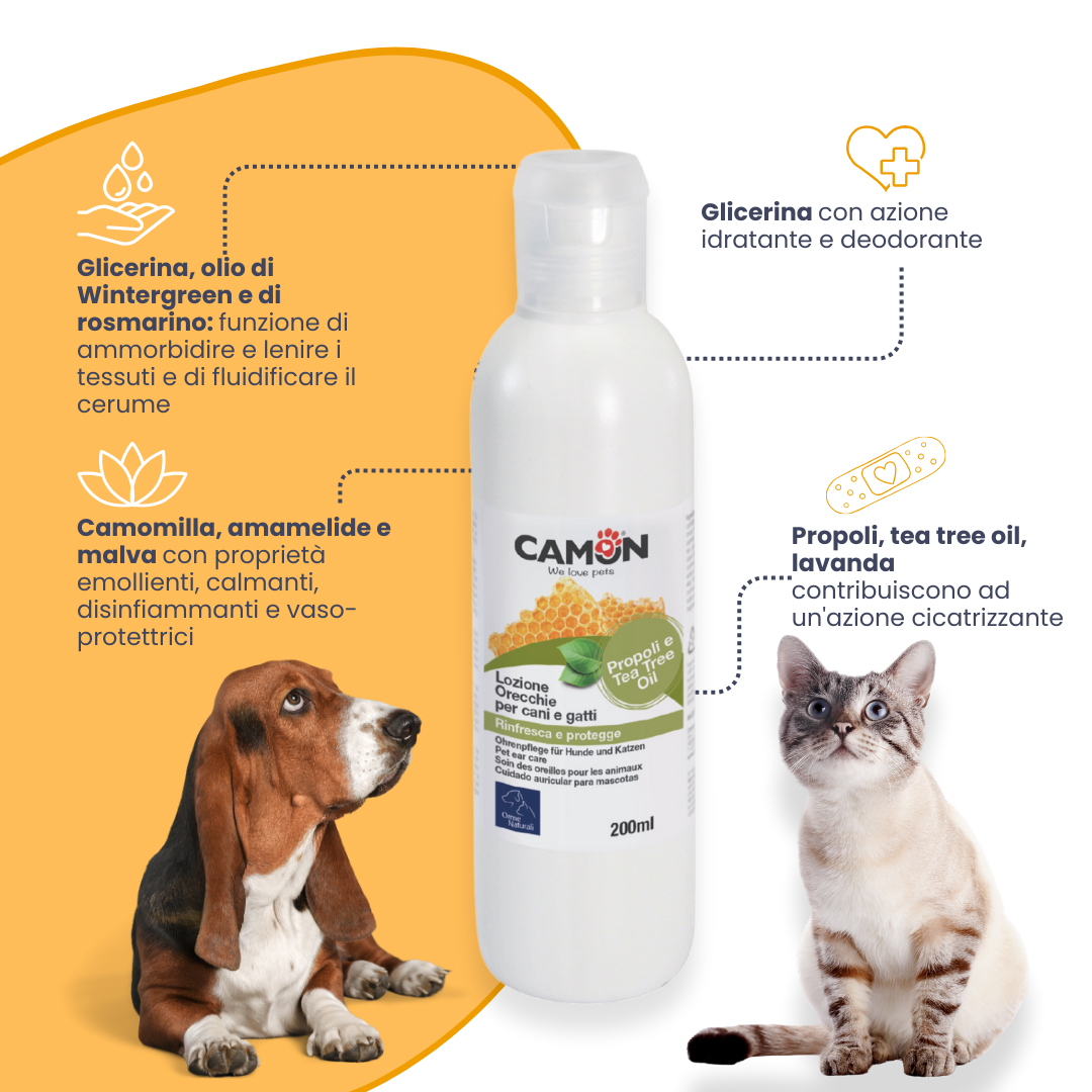 La Lozione Orecchie CAMON Natural deterge delicatamente il condotto uditivo di cani e gatti.