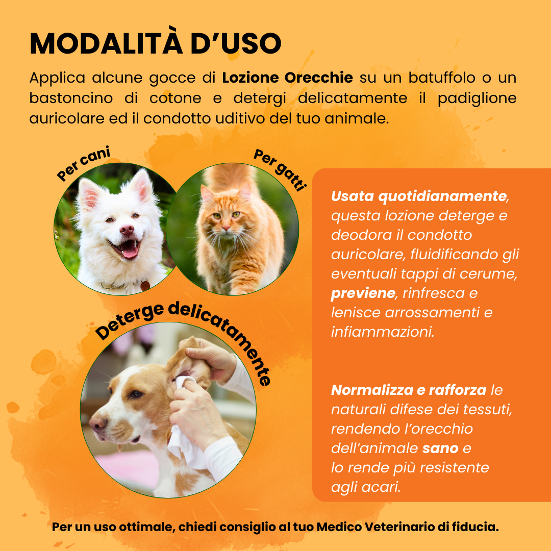Usata quotidianamente igienizza, rinfresca, previene gli accumuli di cerume, calma gli arrossamenti e mantiene il condotto uditivo di cani e gatti protetto e pulito.