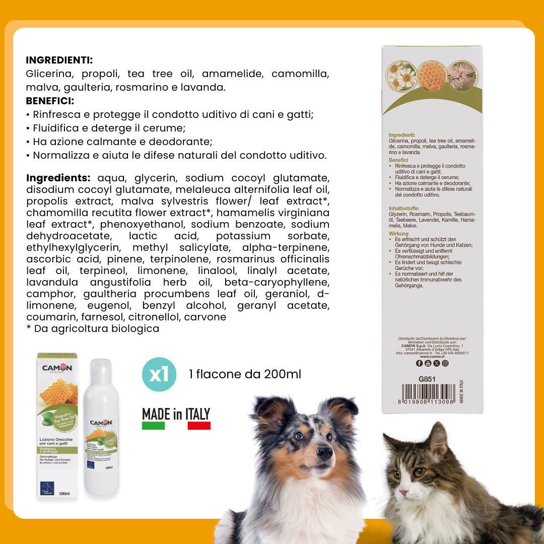 Non solo deterge e rinfresca il condotto uditivo, ma offre anche proprietà antisettiche, antibatteriche e cicatrizzanti. L'uso quotidiano contribuisce a mantenere le orecchie del cane o del gatto pulite, sane e protette dagli acari.